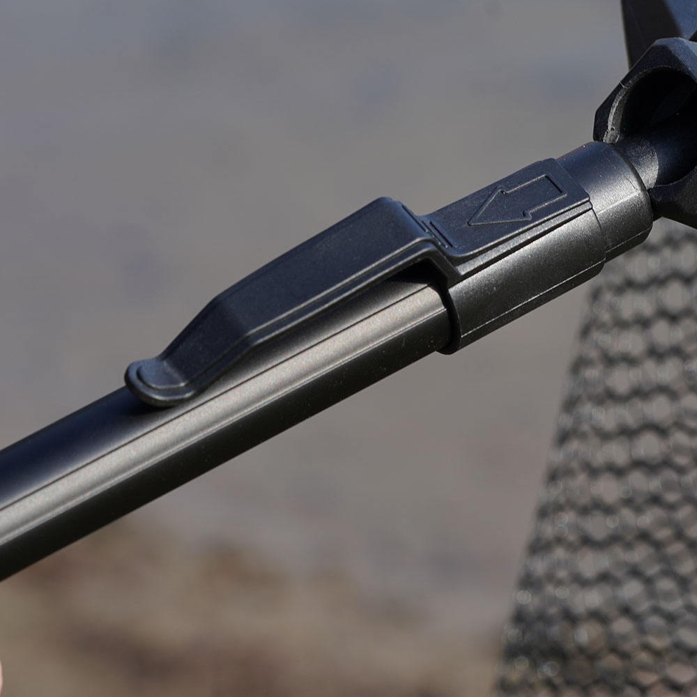 Der Kescher ist mit einer Hand bedienbar und rastet in beiden Positionen ein.